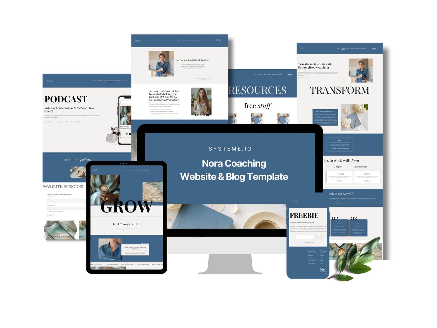 A chic, 15-page Systeme.io website template in calming blue + cream tones. Designed for wellness & life coaches who want to look polished, feel professional, and book clients — without the designer price tag.